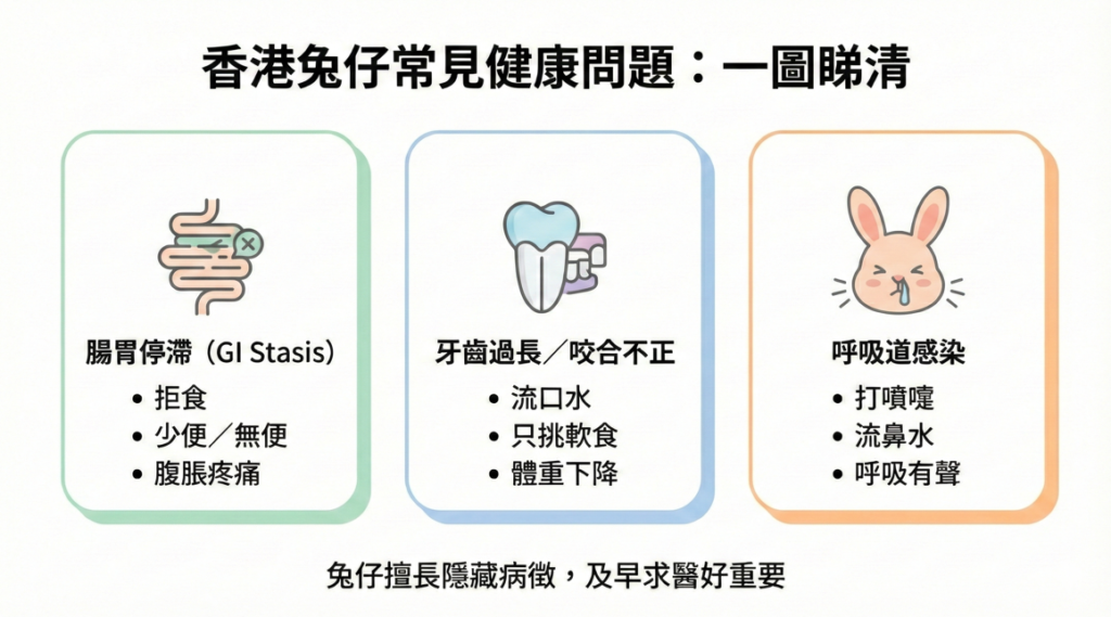 - 腸胃停滯 (GI Stasis): 這是兔仔最常見亦最危險的急症。因疼痛、壓力或飲食不當導致腸道蠕動減慢或停止,若不及時處理,可於24-48小時內致命。