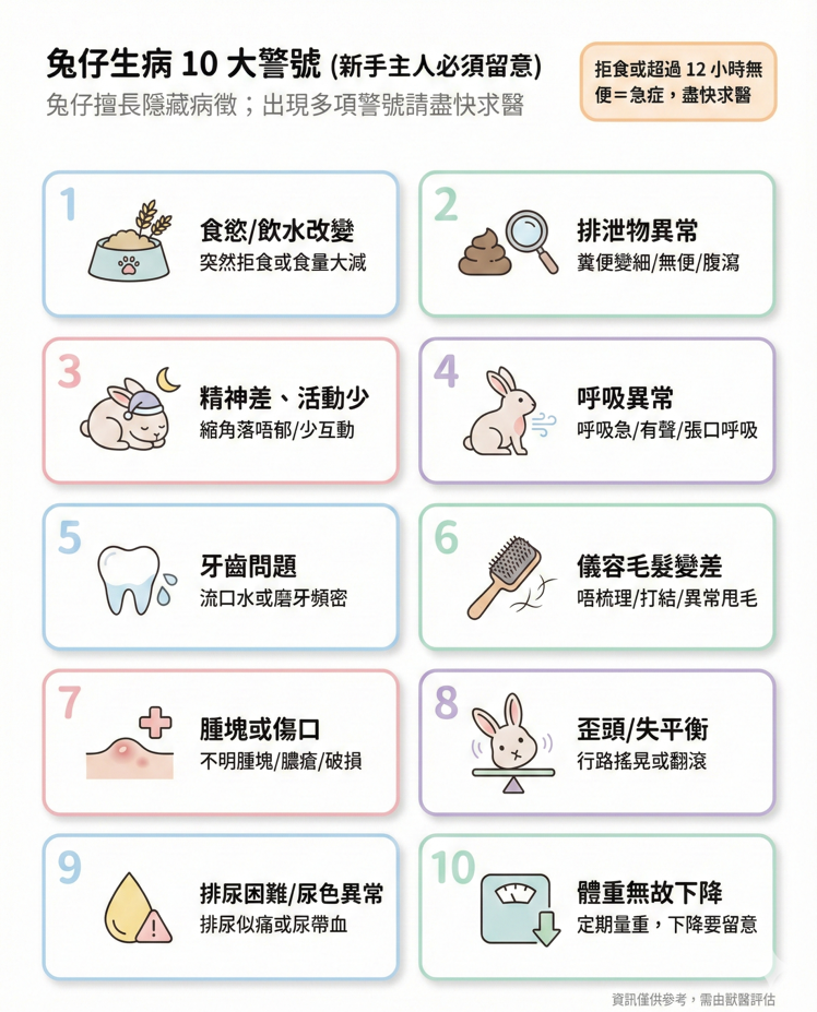 作為負責任的主人,每日細心觀察是守護兔仔健康的關鍵。以下是兔仔生病的常見警號,一旦發現,請務必提高警覺: