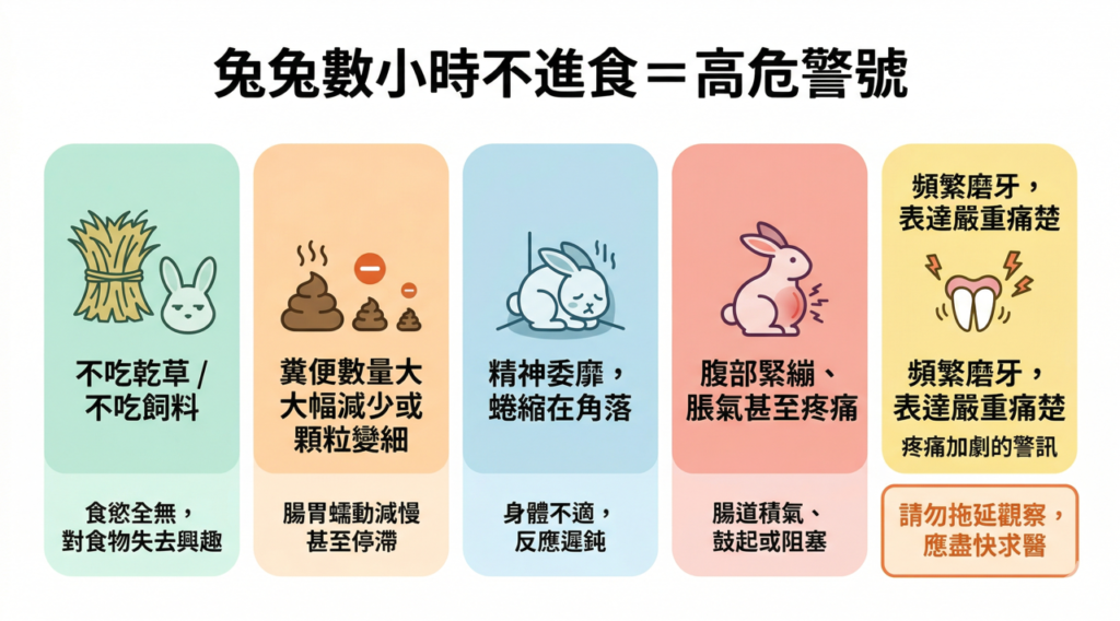 免責聲明:本文僅提供一般資訊,不能取代專業醫療診斷。如有疑問或兔兔出現不進食、少便或精神變差,請盡快預約獸醫檢查。