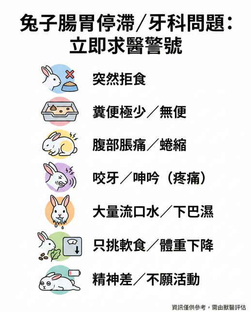腸胃停滯是兔子常見急症,多因低纖飲食、疼痛、壓力或脫水引起。腸道蠕動減慢或停止,食物滯留,腸內細菌過度發酵產生氣體,引發腹脹與劇痛。症狀包括:突然拒食、極少或無排便、腹部膨脹、精神不振、咬牙或呻吟。腸胃停滯發現越早,存活率越高。