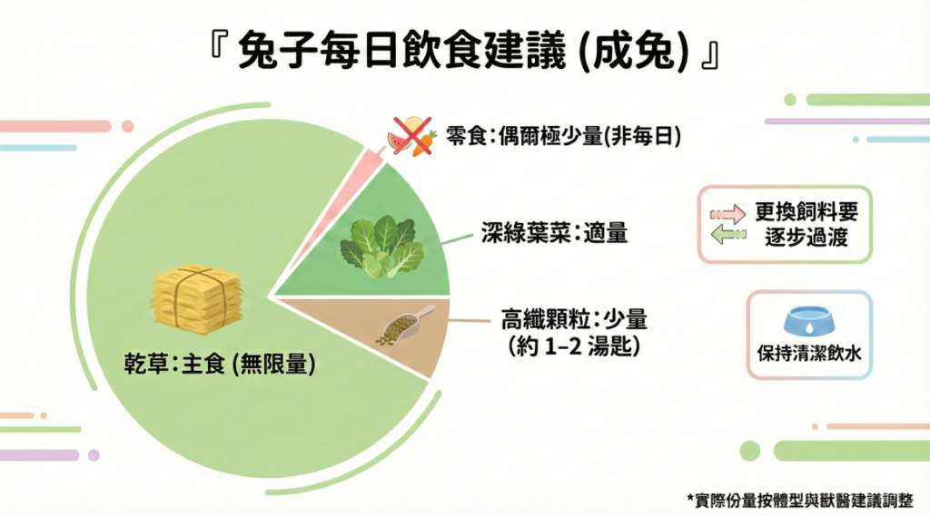 成兔一般每天約 1–2 湯匙高纖顆粒即可,其餘由乾草與蔬菜補充。