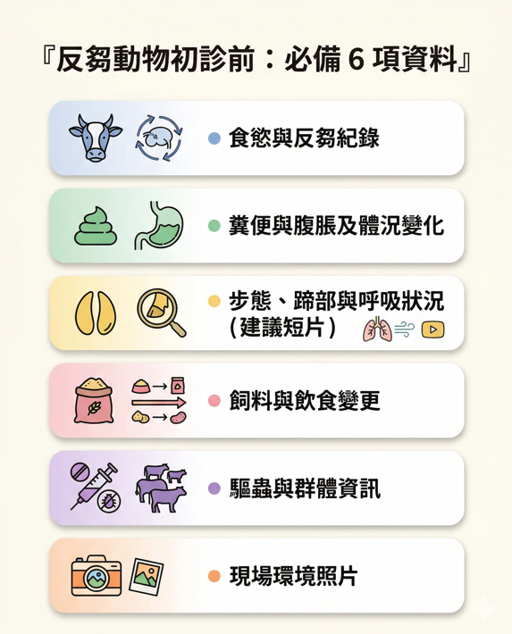 羊與牛都屬反芻動物,很多問題不只與單一器官有關,而是同時牽涉飼料、環境、寄生蟲管理、蹄部護理與群體狀況。正因如此,主人在初診前準備得愈完整,獸醫愈容易在較短時間內掌握方向,減少重複試錯。反芻動物的病史、飲食情況、飼養環境與群體狀況,都是制定治療計畫的重要基礎。