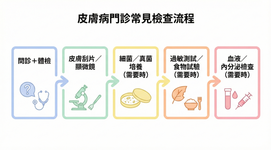 1. 問診與體檢:了解飲食、生活環境、用藥史、近期生活變化;觀察皮膚表現與全身健康。