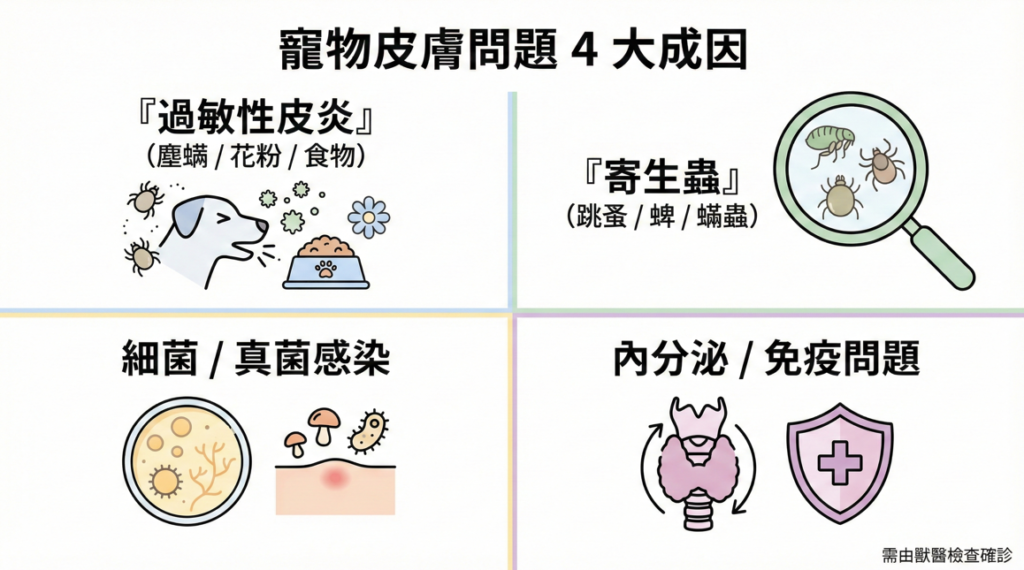 • 過敏性皮炎:由環境過敏原(塵螨、花粉)、食物或接觸物引起。犬貓會出現搔癢、紅疹、舔抓等症狀。