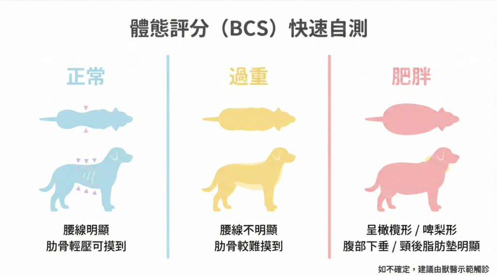 - 正常:腰線明顯、肋骨輕壓可摸到、有輕微脂肪覆蓋