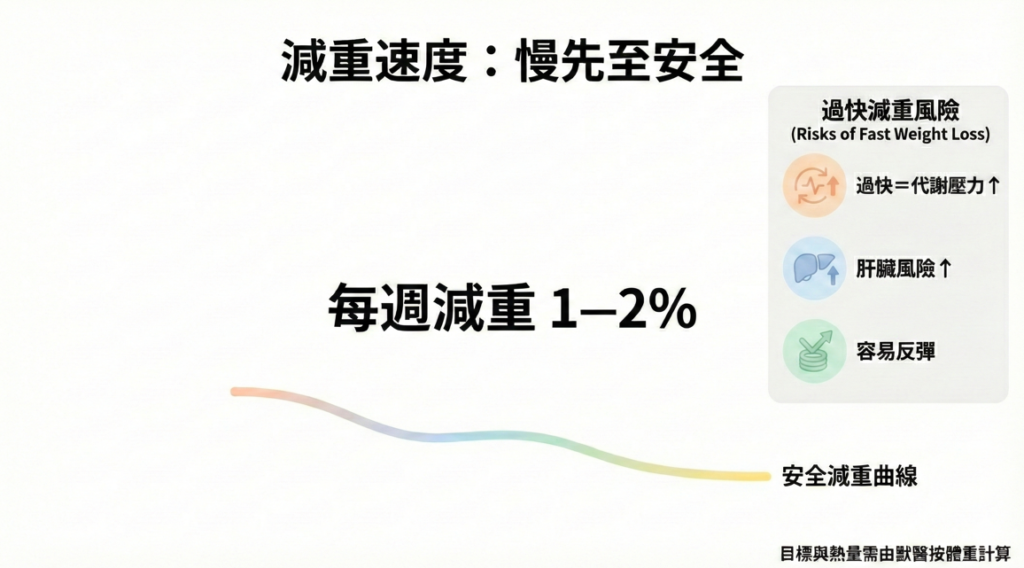 - 一般建議每週減少體重 1–2% 左右,過快減重會影響代謝與肝臟健康