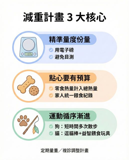 - 由獸醫根據目前體重與理想體重,計算每日建議熱量攝取
