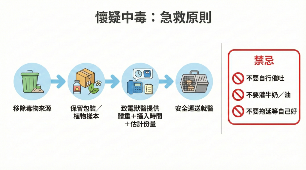 某些毒物不適合催吐;不正確處理反而增加風險。 - 盡快聯絡獸醫診所