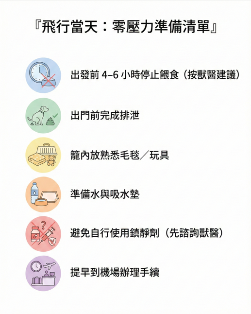 - 飲食控制: 在出發前 4-6 小時停止餵食,避免寵物在飛行途中嘔吐或不適。