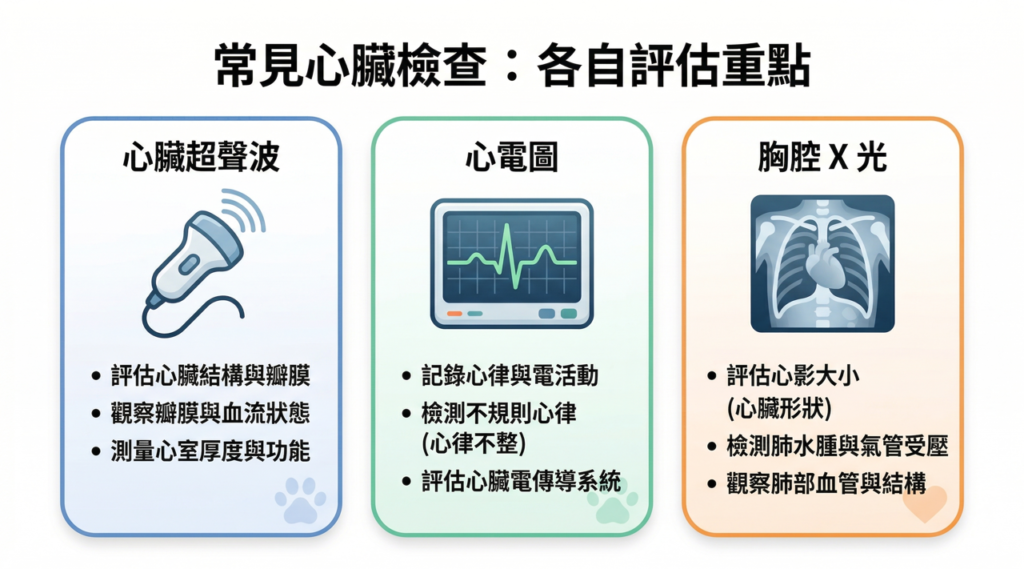 要了解狗狗心臟狀況,往往需要多種檢查配合,而不是單一測試。