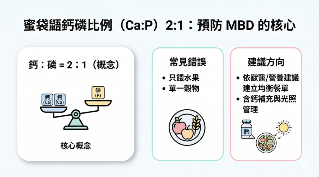 代謝性骨病是我們診所最常接診的蜜袋鼯急症。這主要源於飲食中鈣磷比例失衡(理想比例應為2:1)。在香港,許多飼主習慣只餵食水果或單一穀物,導致鈣質攝取嚴重不足。