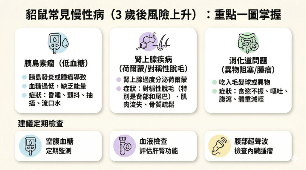貂鼠是純肉食性動物,代謝速度極快,這意味著一旦生病,病情惡化的速度往往超乎飼主想像。在香港,許多貂鼠在 3 至 4 歲後就會進入「中老年期」,此時定期的血液檢查與超音波掃描是及早發現腫瘤的關鍵。