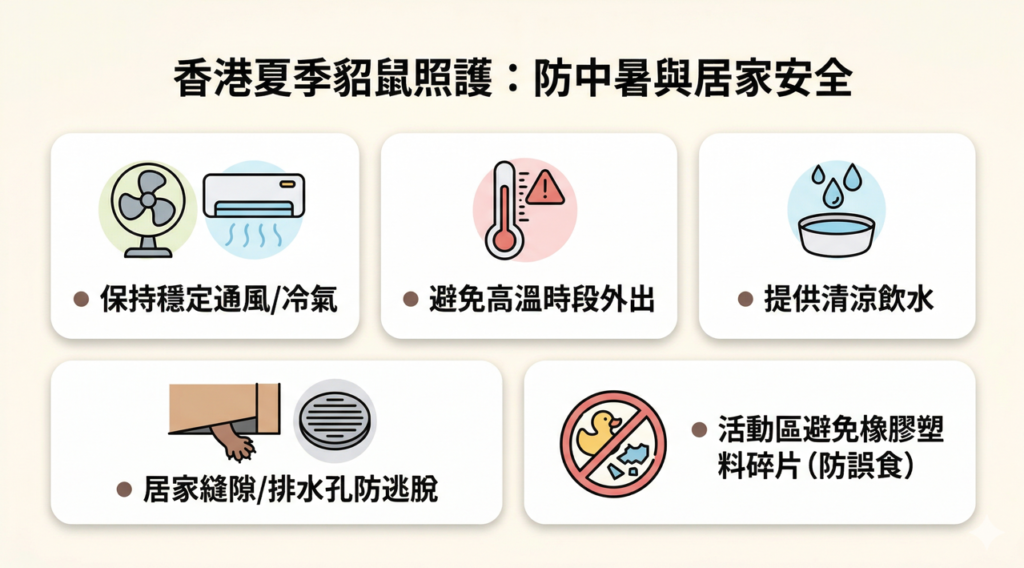 香港夏天悶熱,貂鼠極易中暑。當氣溫超過28度時,貂鼠便有生命危險,建議飼主必須確保 24 小時穩定的冷氣或通風。此外,家中的排水孔、沙發底縫隙必須進行密封,防止貂鼠發生意外。