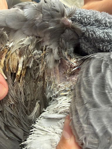 圖一| 初診時右側翼內側皮膚病灶外觀,可見局部羽毛污染、皮膚破損及慢性發炎變化。