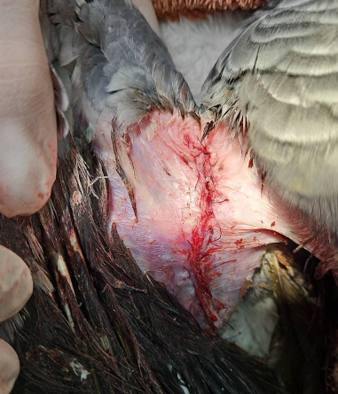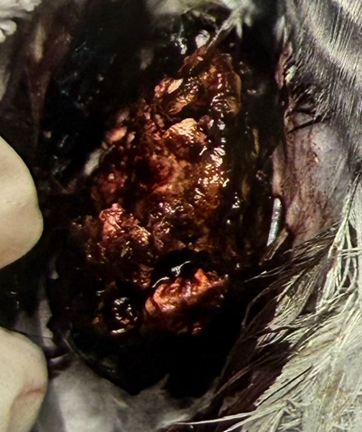 本次個案為一隻非洲灰鸚鵡,右側翼內側皮膚出現慢性病灶,局部受感染且增長迅速。本次個案病理檢查顯示,該病灶確診為皮膚鱗狀細胞癌(cutaneous squamous cell carcinoma, SCC),並伴隨潰瘍形成及繼發性混合細菌感染。由於病灶持續惡化,最終需要在全身麻醉下進行切除手術。