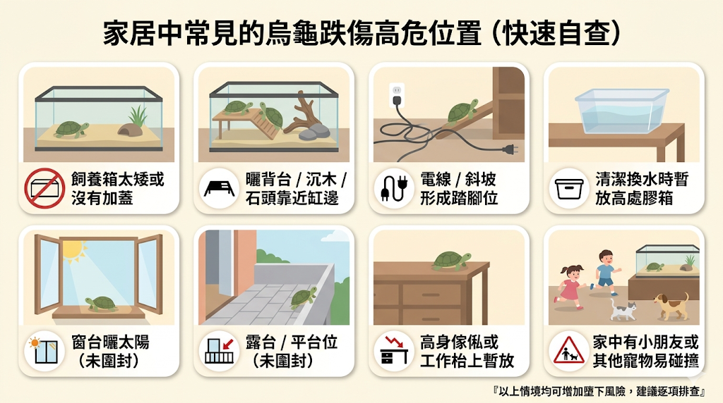 香港住宅環境普遍較緊湊,窗邊、窗台、露台、工作枱、平台位與高身傢俬都很常成為臨時安置寵物的位置。對龜類來說,這些地方全部都屬高危區域。
