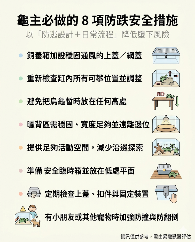 每一次高處墮下意外,對主人和寵物而言都可能是無法挽回的傷害。如對龜隻飼養環境、跌傷處理或異常症狀有疑問,請及早向有經驗的獸醫查詢,讓問題在惡化前得到適當處理。