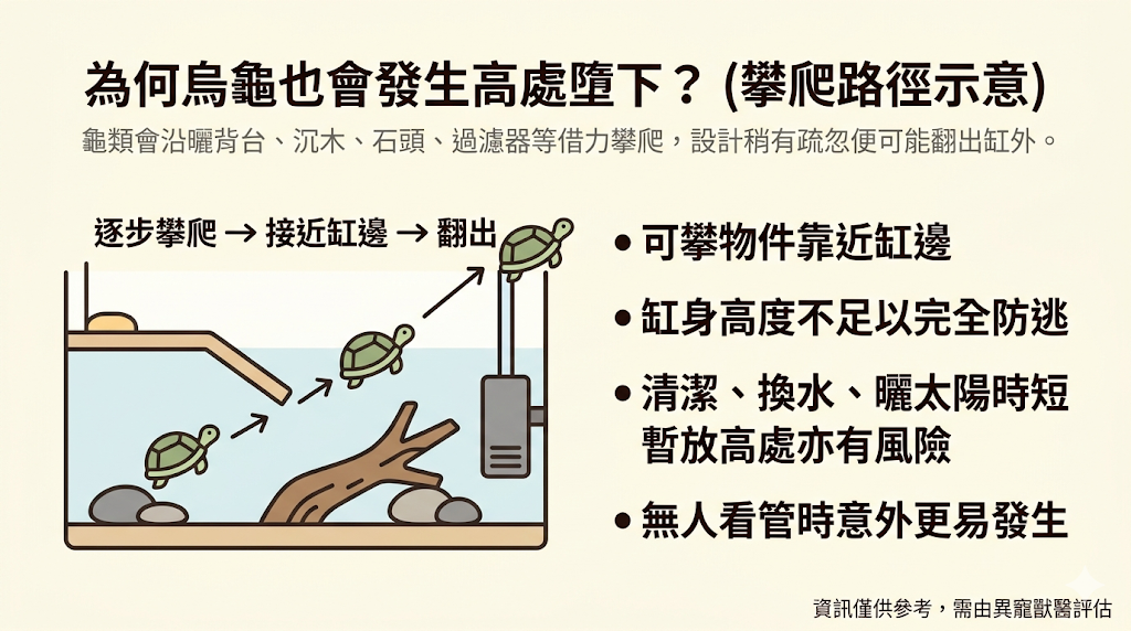 不少人以為烏龜動作慢,風險自然較低。但事實上,龜類比很多人想像中更懂得探索環境。牠們會沿着曬背台、石頭、沉木、過濾器,甚至缸邊角位慢慢借力攀爬。只要飼養箱設計稍有疏忽,或者主人在清潔、換水、曬太陽時把牠們暫時放在高處,就有可能發生跌傷,甚至致命意外。
