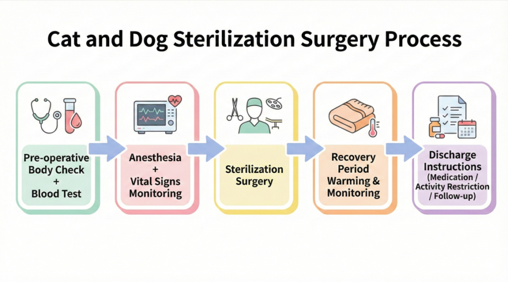 On the day of the surgery, the pet may have a poor appetite or be drowsy due to the effects of the anesthetic, which is normal. If this continues for more than 24 hours, or if you find the wound is abnormally red, swollen, oozing, or bleeding, please contact us immediately.