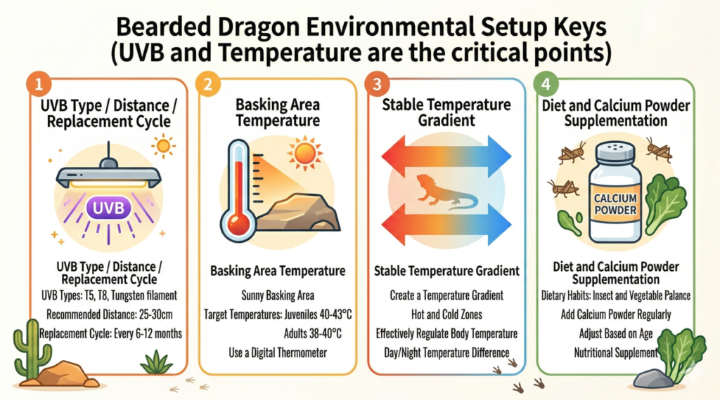 A bearded dragon’s health is closely tied to its husbandry environment, especially UVB exposure, basking area temperature, the overall temperature gradient, diet, and calcium supplementation. When these factors are unbalanced over time, the earliest signs may be reduced appetite, less activity, or lower alertness, and the problem can later progress to affect bone and metabolic health.