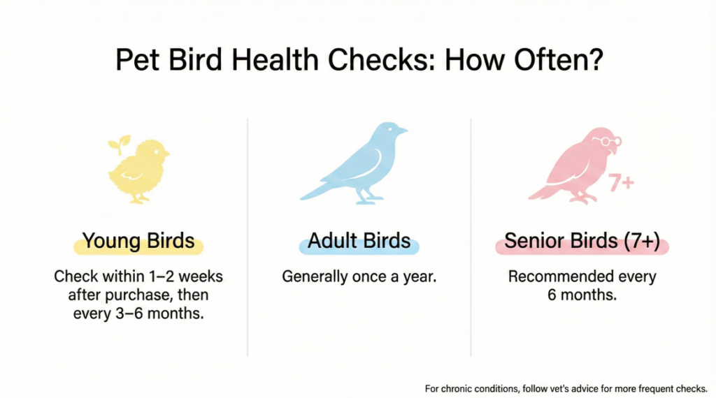 - Young Birds: It is recommended to have a check-up within one to two weeks of purchase, and then every 3–6 months.