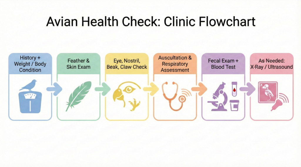 - Feather and Skin Check: The vet will check the feather quality and look for any feather loss or skin lesions.