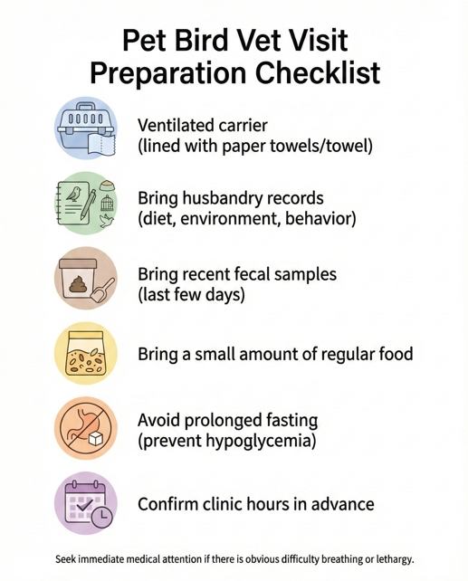 - Confirm the clinic appointment time in advance to avoid the bird going too long without food. You can bring a small amount of food to prevent low blood sugar.