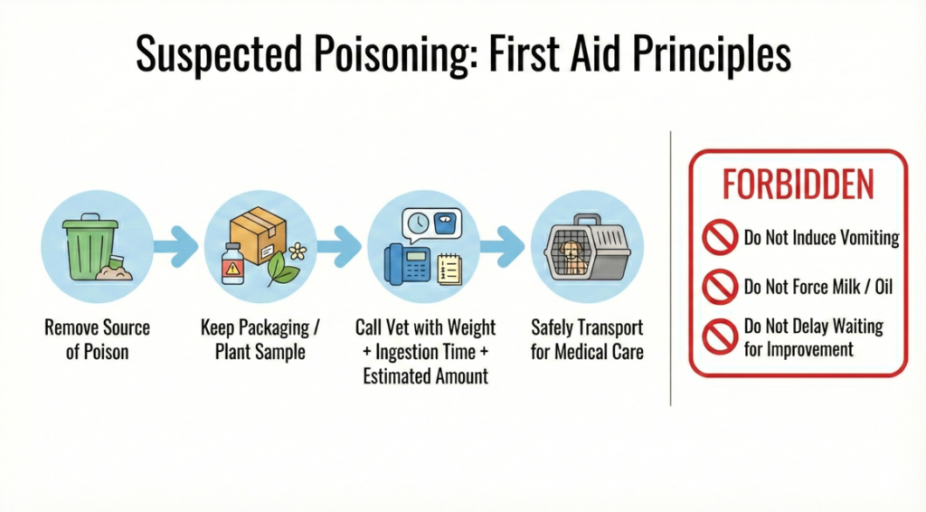 - Do not induce vomiting or force-feed milk/oil yourself: Some poisons are not suitable for induced vomiting; incorrect handling increases risk.