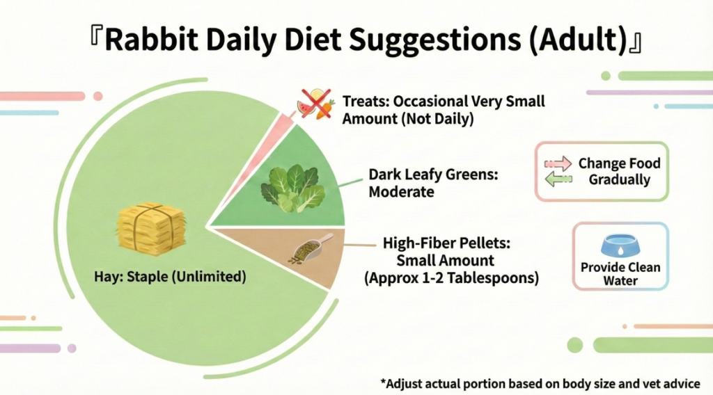 - Control Treats: Only give small rewards during training or bonding to avoid habituating begging. Focus on small amounts of dark leafy greens and deduct from the daily pellet portion; avoid habitually providing fruits/snacks, and avoid treating hay cubes/sticks as “daily essentials.”
