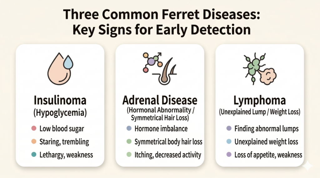 Ferrets are lively, curious animals loved by many families in Hong Kong. However, in exotic pet medicine they are also recognized as a species with a relatively high disease burden. After 3 years of age, the incidence of many chronic diseases rises significantly. Understanding and identifying the three most common major ferret diseases – insulinoma, adrenal disease, and lymphoma – is essential knowledge for every ferret owner. Early detection can greatly improve survival and quality of life.
