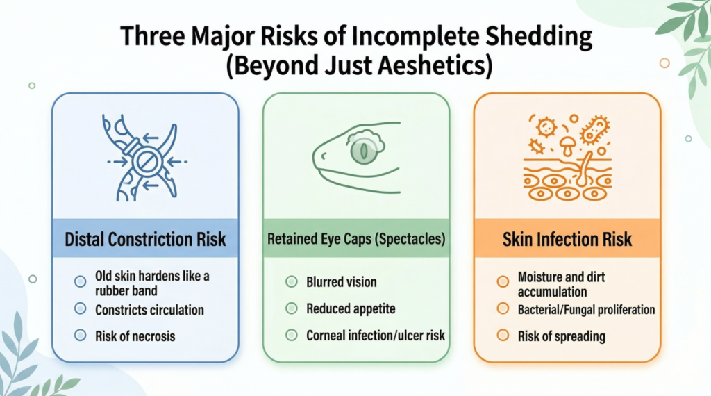 Many owners feel tempted to help when they see skin tearing. However, you should never forcibly peel away retained skin while it is still dry. The new scales underneath may not yet be fully mature, and pulling the skin off can tear away new scales or even dermal tissue, causing severe open wounds, pain, and infection.