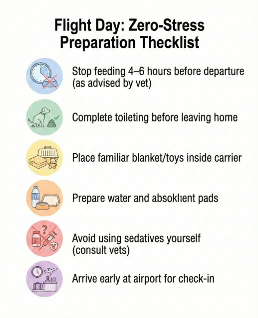 - Control Feeding: Stop feeding 4-6 hours before departure to prevent the pet from vomiting or feeling sick during the flight.